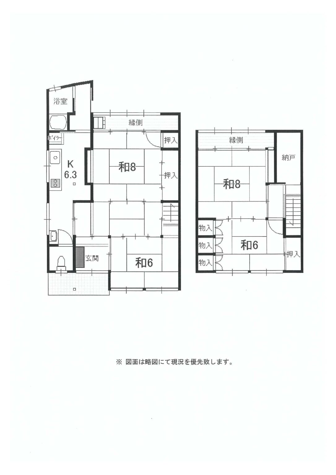 1F:k6.3、和6、和8、縁側、玄関、浴室、WC 2F:和8、和6、縁側